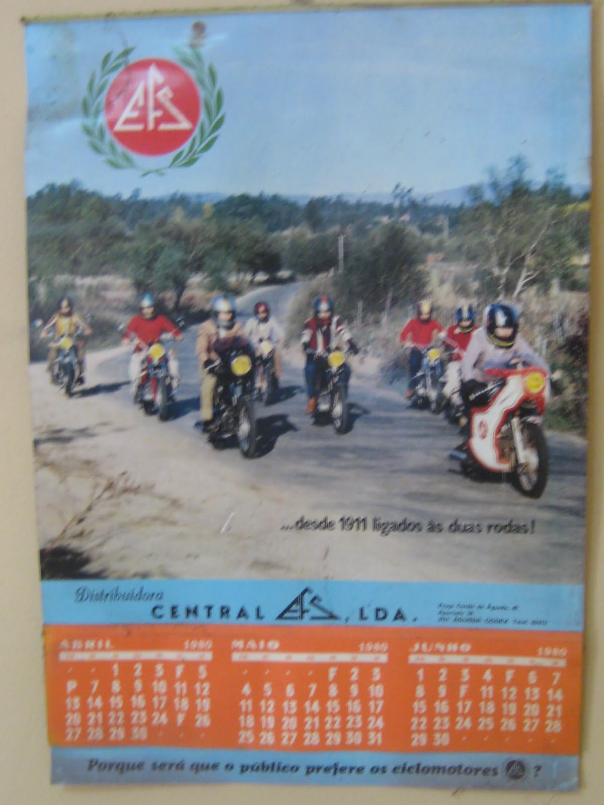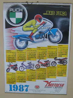 Quando o Rui Herdandinha, da Arraiolbike um dia destes se ofereceu para me mostrar as antigas instalações da oficina de motos da família bem no centro de Arraiolos, não hesitei. Avisou-me logo que não havia lá motos mas ainda assim achei que valia a pena, nem que fosse para imaginar como seria o bulício da terra há 40 anos atrás cheia de movimento e motorizadas paradas à porta da oficina. Lá chegados, as ditas realmente eram só quatro paredes e um tecto que já deve deixar entrar chuva por aqui e ali. E motos, efectivamente não havia nenhuma. Mas, no meio do entulho todo, havia algo bastante interessante, e pelo menos para mim, cheio de vida. Calendários. Calendários de parede dos anos 60, 70 e 80 que apesar da sua idade, dizem muito, seja sobre as motos que se vendiam na altura, seja sobre a forma das promover. Uma maravilha. E todas ainda na parede, independentemente do seu ano. Dir-se-ia que o pai do Rui, que era quem dirigia a oficina na altura, usava o calendário e depois deixava-o na parede como quadro. Grande ideia. E ainda bem que ninguém se lembrou de os tirar de lá.